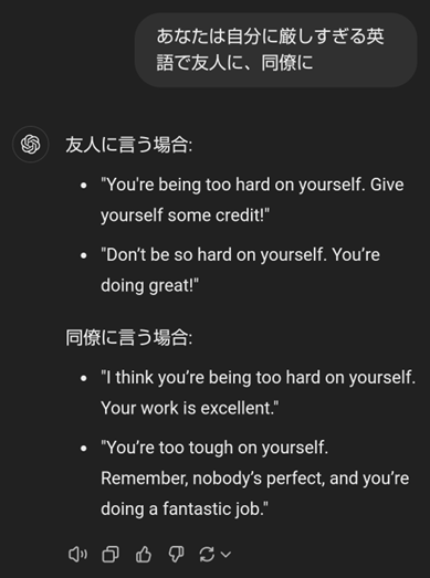 たとえば、「自分に厳しすぎる」という表現を知りたければ、次のように入力するだけです: